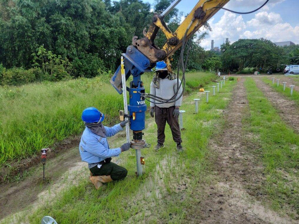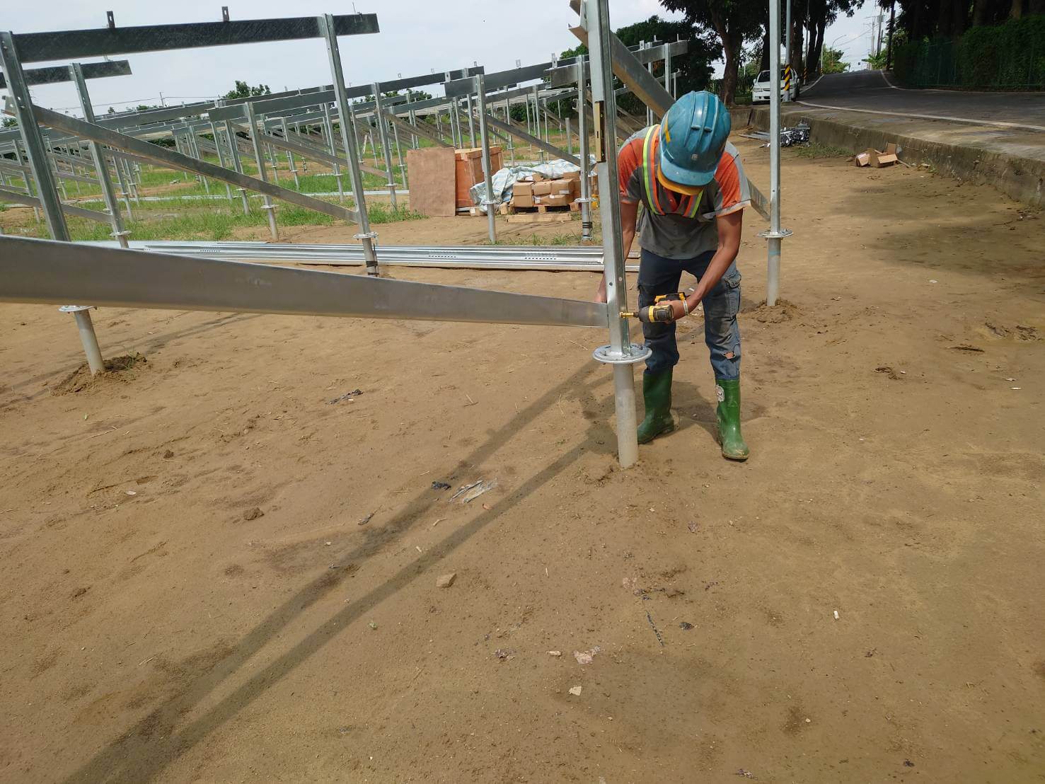 整地、螺旋樁施工、綱構支架太陽能版安裝、直交流電接地安裝、高低壓盤體、機電平台連工帶料、TR、RMU安裝、地下管路佈放、物料貨櫃拆櫃